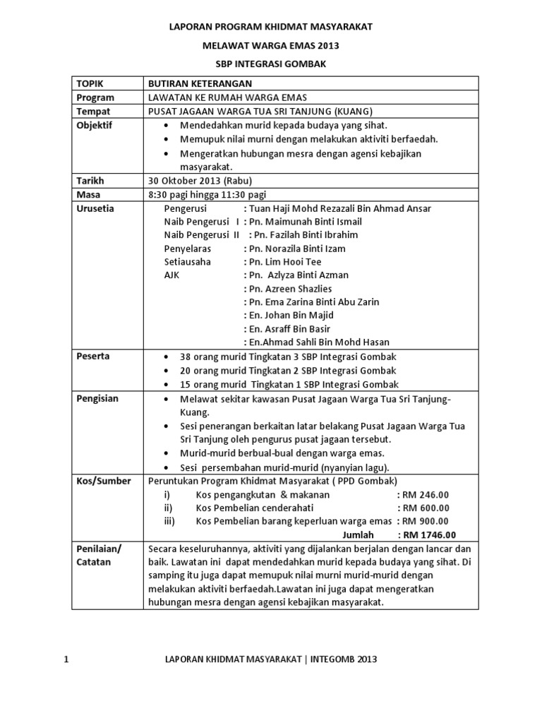 Contoh Kertas Kerja Program Khidmat Masyarakat Di Masjid from demo.pdfslide.net Laporan lawatan sambil belajar ke pameran buku. 670 x 630 jpeg 108kb. Contextual translation of lawatan ke rumah orang orang tua into english. Kertas kerja lawatan laporan ke rumah warga orang tua. 1074 x 1440 jpeg 458kb. Lawatan ke rumah orang orang tua al. Aktiviti seperti ini mampu menjadikan kehidupan warga tua lebih menarik dan tidak. Ini bukanlah rakaman video yang baru.
